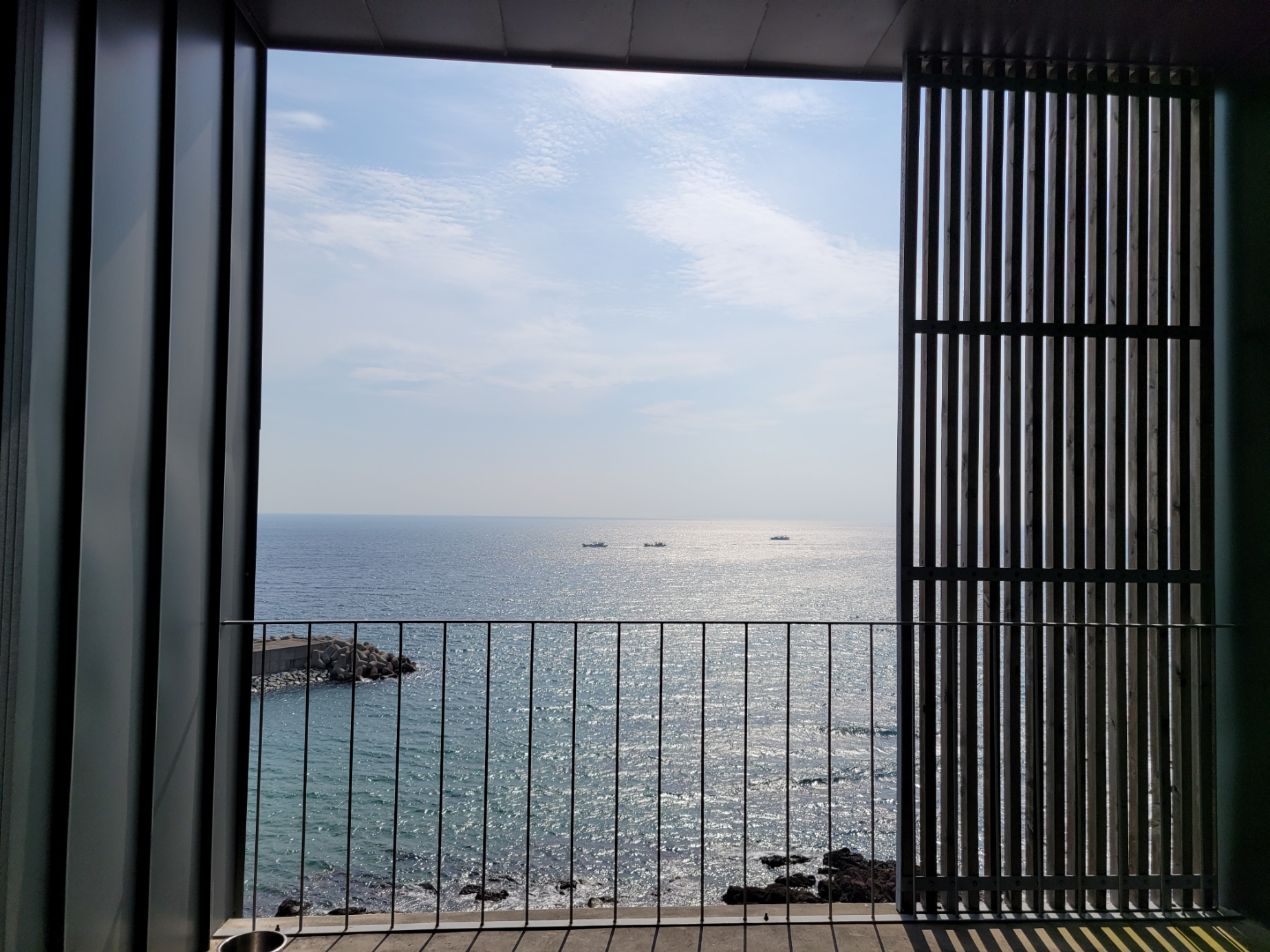 방은 크지는 않은 편이었으나 깔끔했고, 문 열자마자 바다가 보여 시원한 느낌이 들었어요.